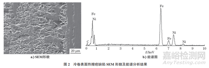 在熱擦疤缺陷處截取試樣,對(duì)試樣進(jìn)行掃描電鏡和能譜分析,結(jié)果如圖2所示。由圖2可知:缺陷處表面可見明顯的翹皮,有的地方翹皮已經(jīng)脫落,缺陷處無其他雜質(zhì)元素。