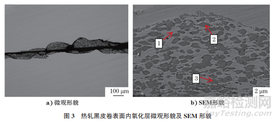 在酸洗前黑皮卷橫截面上截取金相試樣,用光學(xué)顯微鏡和掃描電鏡觀察試樣,結(jié)果如圖3所示。由圖3可知:黑線為兩個(gè)試樣堆疊的接觸面,氧化層前沿呈波浪狀,與合金基體接觸,深淺不一,氧化深度最深處約100μm,氧化層為深灰色的氧化物,在基體中呈不連續(xù)分布。