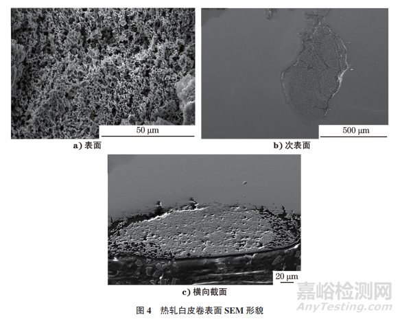 白皮卷經(jīng)酸洗后可見珊瑚狀的FeNi3基體,隨著酸洗的進(jìn)行,內(nèi)氧化層底部酸液的濃度會(huì)逐漸降低,再加上此時(shí)基體中的Ni元素質(zhì)量分?jǐn)?shù)已高達(dá)80%,耐腐蝕性比原基體增強(qiáng)了許多,使新的酸液不能接觸到內(nèi)氧化層的底部,氧化物不能被酸洗干凈。這就導(dǎo)致了酸洗后的白皮卷看起來表面已酸洗干凈,但實(shí)際次表面還有殘留的氧化物未被酸洗掉,隨著后續(xù)冷軋退火工序的進(jìn)行,合金延展后底部殘留的氧化物暴露出來,在冷軋卷板表面形成熱擦疤缺陷。