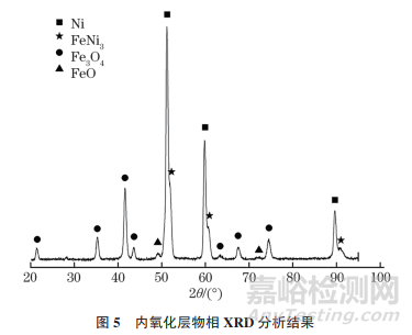 對(duì)內(nèi)氧化層進(jìn)行X射線衍射分析,結(jié)果如圖5所示。由XRD結(jié)果可以判斷物相1為FeNi3,物相2,3主要為Fe3O4和FeO等氧化物,F(xiàn)e3O4 和FeO等氧化物呈島狀分布在FeNi3基體中。