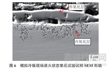 4J36因瓦合金的成分比較簡單,Cr、Si、Al等提高材料耐氧化性的合金元素含量較少,坯料在加熱爐和保溫的過程中發(fā)生選擇性氧化,表面形成較厚的外氧化層和內(nèi)氧化層,但由于外氧化層與合金基體的熱膨脹系數(shù)不同,導(dǎo)致其在冷卻過程中與合金基體分離脫落,熱軋卷經(jīng)退火、噴丸、酸洗工序后,外氧化層已去除,檢驗(yàn)時(shí)沒有發(fā)現(xiàn)殘留的外氧化層。在實(shí)驗(yàn)室模擬冷板現(xiàn)場退火狀態(tài)下的氧化情況,在加熱爐中加熱到950℃,保溫2min后,對(duì)橫截面進(jìn)行檢驗(yàn),發(fā)現(xiàn)內(nèi)氧化層厚度已經(jīng)達(dá)到15μm左右,可見該合金的氧化速率較快。模擬冷板現(xiàn)場退火狀態(tài)氧化試驗(yàn)試樣SEM形貌如圖6所示。