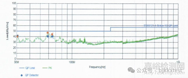 通過將試驗(yàn)測量值與檢測標(biāo)準(zhǔn)限值比較來判斷EUT的輻射發(fā)射是否超標(biāo),測量值低于限值則PASS,反之則FAIL。