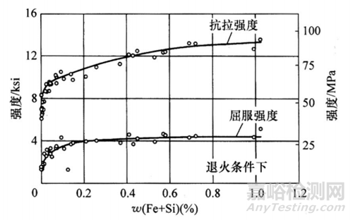 圖2 鐵和硅作為雜質(zhì)元素對(duì)鋁的抗拉強(qiáng)度和屈服強(qiáng)度的影響