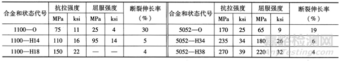 注:薄板試樣寬13mm(0.5in)寬,厚1.59mm(0.06in)。0-退火;W一固溶水淬后立即測(cè)試;T4-固溶水淬后在室溫下時(shí)效;T6-在 T4后高溫時(shí)效。
