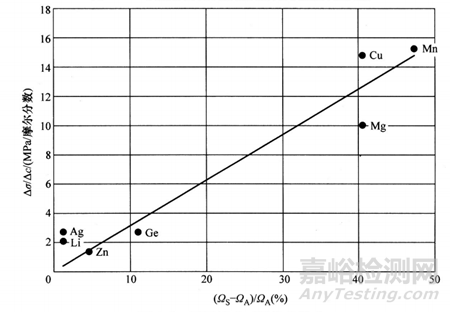 固溶強(qiáng)化作用大小取決于溶質(zhì)原子濃度、原子相對(duì)尺寸、固溶體類型、電子因素和彈性模量。一般來說,溶質(zhì)原子濃度越高,強(qiáng)化效果越大;原子尺寸差別越大,對(duì)置換固溶體的強(qiáng)化效果亦可能越大;溶質(zhì)原子與鋁原子的價(jià)電子數(shù)相差越大,固溶強(qiáng)化作用亦越大;彈性模量大小的差異度越大,往往強(qiáng)化效果越好。