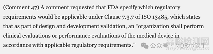 鑒于美國FDA文件中的參考資料,第 7.3.7 條似乎是相關(guān)的和可執(zhí)行的, 從而使臨床評估成為一個必要的過程。然而,進(jìn)一步研究FDA的意見和答復(fù),我們會發(fā)現(xiàn)更多的啟示: