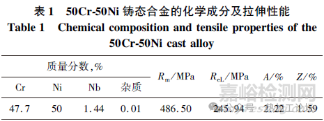 試驗材料為鑄態(tài)合金50Cr-50Ni,主要化學成分及力學性能見表1。