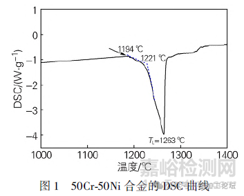 在50Cr-50Ni鑄態(tài)合金塊上利用線切割切取?3mm×4mm尺寸試樣,并用1500號砂紙打磨掉氧化層,使用無水乙醇清洗表面,使用電吹風機吹干,在STA-449C-Jupiter設備上進行DSC分析。以30℃/min的速度從室溫升溫到1000 ℃,然后以6℃/min 的速率加熱至目標溫度,保溫15min左右后以6℃/min 降溫至1000℃,再以30℃/min 降至室溫。整個加熱、保溫和冷卻過程保持氮氣充盈,得到50Cr-50Ni合金的DSC熔化曲線,如圖1所示。
