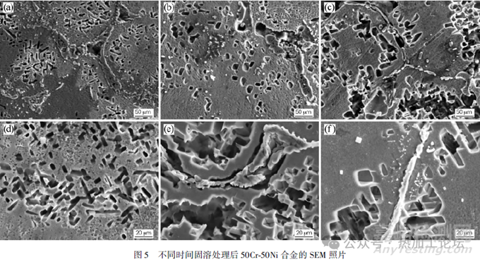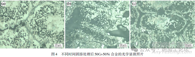 研究表明,固溶處理在很大程度上影響合金的顯微組織。圖4為50Cr-50Ni合金不同時間固溶處理后的合金的顯微組織。由圖4(a)可見,經過1180℃固溶2h 后合金的析出相呈細小的長條顆粒狀,分布在晶界附近。絕大多數析出相基本回溶至基體中,只有少數過大的析出相保留。由圖4(b) 可見,經過1180℃固溶3h后,析出相與固溶2h時相比幾乎沒有減少,可以看出固溶2h后合金為過飽和固溶體。固溶3h后,晶界附近的析出相開始合并粗化,非晶界附近的析出相與固溶2h相比無明顯減少,較大的析出相甚至發(fā)生了跨晶界合并。由圖4(c)可見,經過1180℃固溶4h后,析出相再次呈現扁條顆粒狀出現,密度較大,有明顯的晶粒合并粗化現象,晶界上也出現了析出相,且并非所有晶界附近都存在析出相,析出相分布更加的雜亂無章。