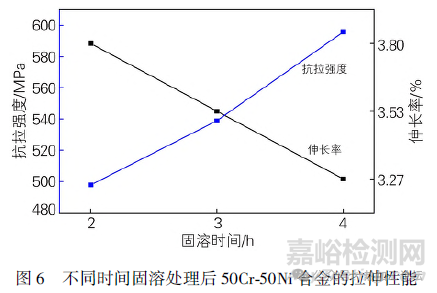 圖6為不同時間固溶處理后50Cr-50Ni合金的拉伸性能。從圖6以看出,合金抗拉強度與固溶時間呈正相關關系,即抗拉強度隨固溶時間的提高而增加。當固溶時間為4h時,抗拉強度為597.83MPa,比固溶2h和3h時的抗拉強度分別提高100MPa和60MPa,而斷后伸長率與固溶時間呈負相關關系,斷后伸長率從固溶2h時的3.8%降到了固溶4h時的3.27%,合金的塑性隨著固溶時間的增加不斷下降,但下降幅度較小。