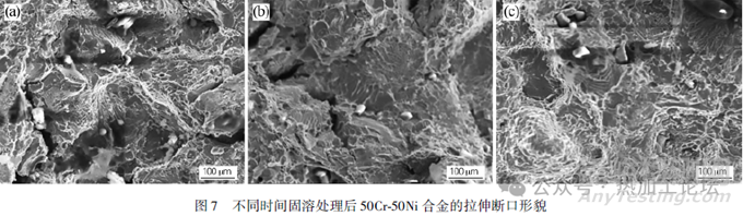 為分析材料的斷裂機制,對各組試樣的拉伸斷口進行SEM形貌分析。從圖7的斷口照片來看,斷口形貌主要為臺階式的斷層,似河流花樣,這些斷面可能是由于裂紋沿晶界擴展引起的,根據觀察到的斷口形貌,試樣的斷裂機制為韌脆混合型斷裂。從圖7(a)中可以觀察到,固溶2h 試樣的斷裂面存在少量的韌窩,并在周圍伴隨著較明顯的撕裂棱,相對其它兩個固溶時間較長的試樣,其韌性略好一些。因此,增加固溶處理時間會使50Cr-50Ni合金的塑性降低。