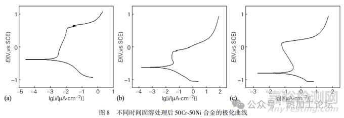 圖8為50Cr-50Ni合金經不同時間固溶處理后在3.5%NaCl溶液中的極化曲線。由圖8可知,外測電流密度隨電位的增加而減小,說明在陰極極化時,溶氧會向外擴散。試驗的最后,用電化學工作站自帶的擬合軟件進行分析,可以通過試驗數據得到本次試驗相對應的自腐蝕電位和自腐蝕電流密度,結果見表2。