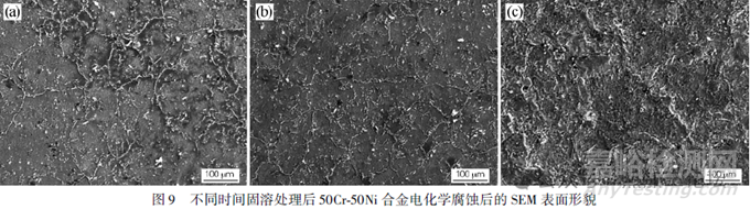 圖9為50Cr-50Ni合金經過電化學腐蝕(陽極極化)后通過SEM觀察到的表面腐蝕形貌。從圖9(a)可以看出,經過2h 固溶處理的試樣,極化試驗后表面出現輕微開裂,腐蝕不嚴重。從圖9(b)可以看出,當合金固溶處理3h后,陽極極化試驗后的表面出現少量裂紋,表面凹凸不平,凸顯析出物的分布形貌,腐蝕加重,合金被輕微破壞。從圖9(c)可以看出,當合金固溶處理4h 后,經過陽極極化試驗后,合金表面存在大量的裂紋,表面斑駁不平,腐蝕嚴重。因此,在1180℃ 固溶溫度下,隨著固溶時間的增加,50Cr-50Ni合金的耐蝕性顯著下降。