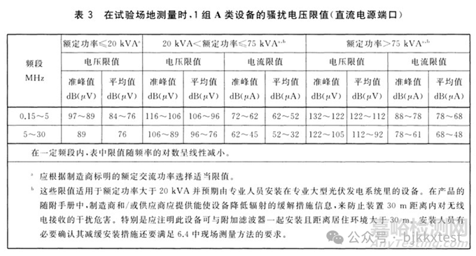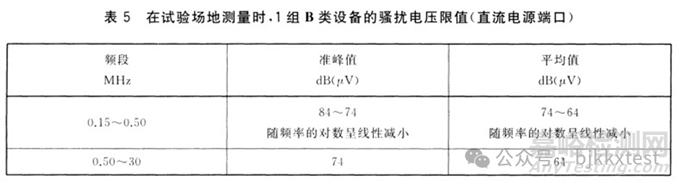 在試驗(yàn)場(chǎng)地測(cè)量時(shí),使用150Ω的CISPR網(wǎng)絡(luò)(DC-AN)(見7.3.2.3和附錄I)或電流探頭(見GB/T6113.102-2018)。150kHz~30MHz頻段的低壓直流電源端口騷擾電壓限值的規(guī)定見表3和表5。