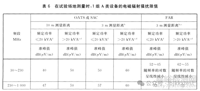 1組A類和B類設(shè)備在30MHz~1GHz頻段內(nèi)的電磁輻射騷擾限值的規(guī)定見表6和表7。保護(hù)特殊安全無線電業(yè)務(wù)的專門條款和限值參見附錄E和表E.1。在開闊試驗(yàn)場(chǎng)地(()ATS)或半電波暗室(SAC)測(cè)量時(shí),A類設(shè)備可在3m、10m或30m標(biāo)準(zhǔn)距離下測(cè)量(詳見表6),而B類設(shè)備可在3m或10m標(biāo)準(zhǔn)距離下測(cè)量(詳見表7)。小于10m的測(cè)量距離只適用于符合3.17所規(guī)定的小型設(shè)備。