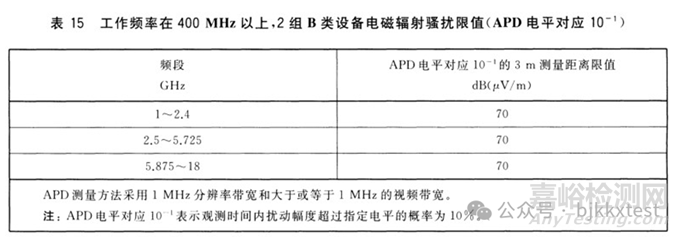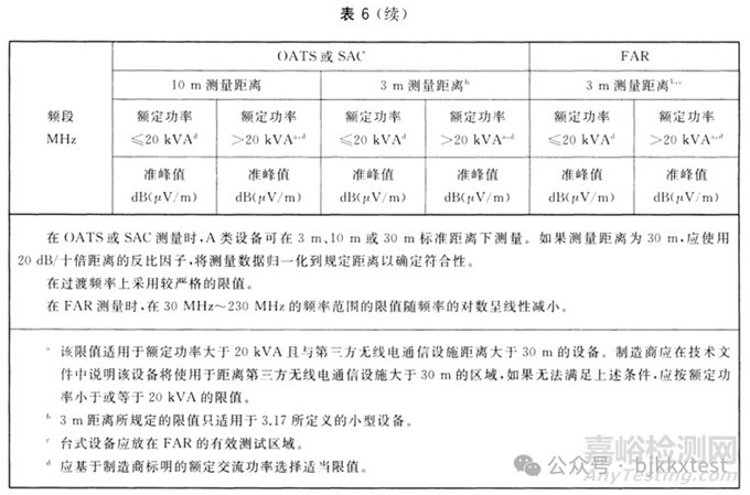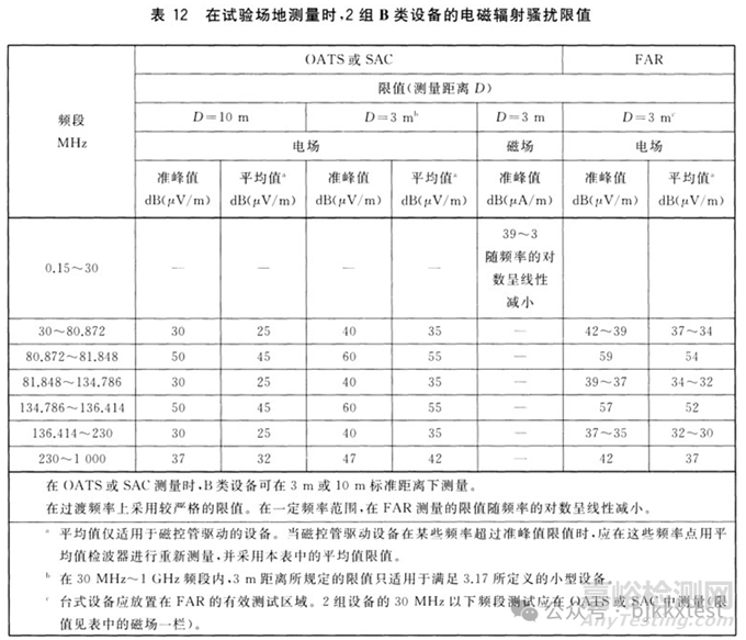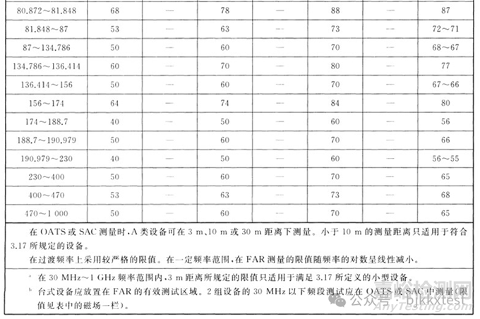 使用帶峰值、準(zhǔn)峰值或平均值檢波器的儀器測(cè)量時(shí),受試設(shè)備應(yīng)滿足對(duì)應(yīng)表格中的限值要求30MHz以下頻段的限值是指電磁輻射騷擾的磁場(chǎng)分量,30MHz以上頻段的限值是指電磁輻射騷擾的電場(chǎng)分量。