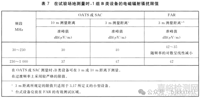 如果EUT能放人全電波暗室(FAR)的有效測(cè)試區(qū)域中,A類和B類設(shè)備可以在FAR的3m標(biāo)準(zhǔn)距離下進(jìn)行測(cè)試(詳見表6和表7)。按照本標(biāo)準(zhǔn)使用FAR場(chǎng)地測(cè)量時(shí)僅適用于臺(tái)式設(shè)備。