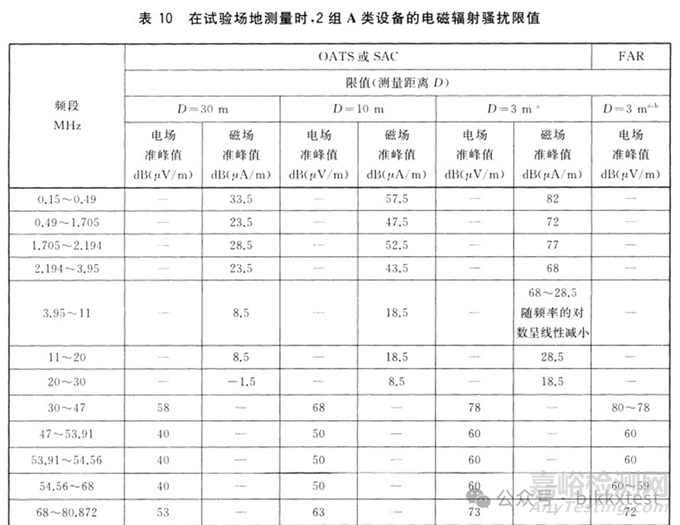 在OATS或SAC中測(cè)量時(shí),A類設(shè)備可在3m、10m或30m距離下測(cè)量,而B類設(shè)備可在3m或10m距離下測(cè)量(見表10和表12)。
