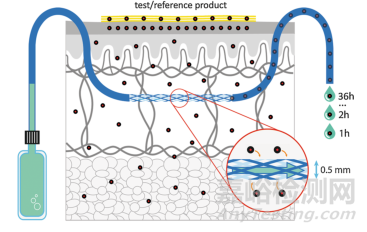 微透析法是將探針放置在皮膚中通過微透析泵灌注無菌緩沖液,模擬血管通透性作用,以透析原理實現(xiàn)灌流液與細胞外小分子物質(zhì)交換,進而可以體內(nèi)取樣,該技術關鍵問題是如何對取出樣品準確校正,即探針回收率測定;回收率準確性影響因素包括體內(nèi)藥物吸收、代謝及蛋白結合的因素,體外灌流速度、灌流組成、半透膜性質(zhì)、探針位置等;微透析法比較適用于水溶性、小分子物質(zhì)的采樣,新研發(fā)的開放式微灌注是探針設計具有開放的交換區(qū)域,可以直接采樣間質(zhì)流體,無藥物分子大小,蛋白結合和親脂性限制,如下圖2所示,但需要主動推泵,避免灌注液在組織中損失和水腫風險[3]。目前該方法存在缺乏準確易操作的探針回收率校正方法,操作技術要求高,成本高,會對組織造成一定的損傷[4]等問題;