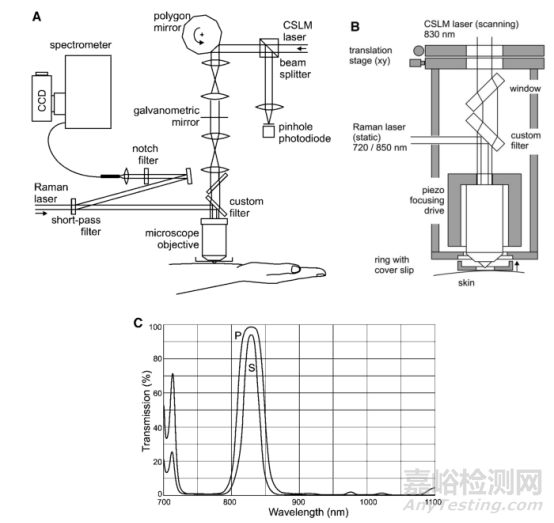 共聚焦拉曼光譜法是一種非侵入性分析內(nèi)源性皮膚成分的方法,已廣泛應用于角質(zhì)層厚度、角質(zhì)層水分和經(jīng)皮促滲劑效果的測定,其原理是激光束通過顯微鏡聚焦到皮膚上,散射光通過窄阻帶過濾波器引導,由同一顯微鏡聚焦,之后將光聚焦到一根光纖上得到光譜圖,其設備組成如下圖3所示。共聚焦拉曼光譜法是一種無創(chuàng)、快速、實時監(jiān)測皮膚藥動學研究方法,但只能提供相對藥濃度,不能提供絕對藥物濃度。