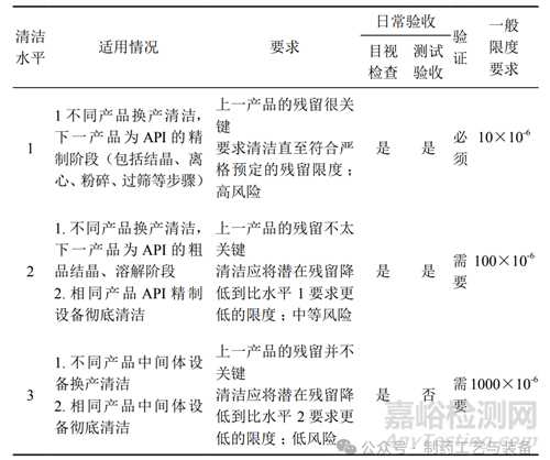 隨著原料藥合成步驟越來越接近原料藥成品,清潔徹底程度逐步增加,上一產(chǎn)品在下一產(chǎn)品中允許殘留量會減少,而API 后續(xù)物理操作,例如物料干燥、過篩或粉碎,不會降低潛在殘留量,所以在 API 物理操作過程,清潔殘留的限度要求更加嚴(yán)格。根據(jù)以上原則,確定了如下的清潔水平矩陣表(見表1)。
