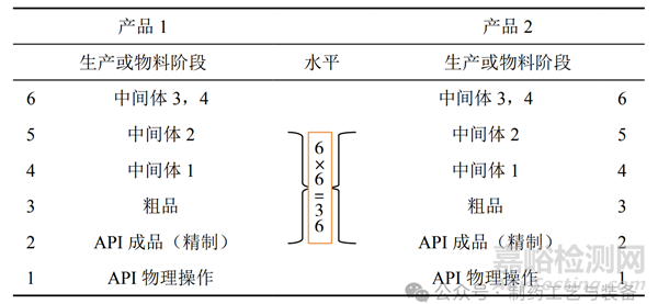 根據(jù)原料藥生產(chǎn)過程及各步物料種類、中間體及離最終成品的遠(yuǎn)近,將原料藥生產(chǎn)過程各步物料分為6個階段。6個階段的物料隨著合成步驟越來越接近原料藥成品,清潔的徹底程度也逐步嚴(yán)格,上一產(chǎn)品在下一產(chǎn)品中允許殘留量逐步減少。以上6種物料所處的階段,換產(chǎn)清潔時最多有6×6=36種組合,形成不同產(chǎn)品不同物料階段共用關(guān)系組合表(表2)。