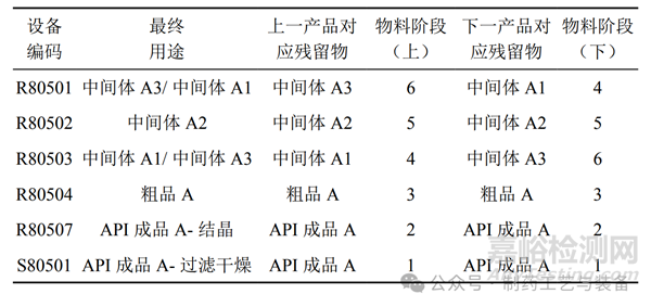 以一個車間3個產(chǎn)品共用一條生產(chǎn)線為例,根據(jù)工藝流程、設(shè)備共用關(guān)系分別為各產(chǎn)品建立清潔產(chǎn)品信息表(見表3),因為不同的物料階段對應(yīng)的清潔要求不盡相同,所以應(yīng)針對產(chǎn)前產(chǎn)后殘留物不同的特點,分別建立了產(chǎn)前產(chǎn)后不同殘留物對照信息;如 R80501生產(chǎn) A 產(chǎn)品后殘留物應(yīng)該是中間體 A1;對于上一產(chǎn)品換產(chǎn) A 產(chǎn)品時殘留物是中間體 A3;以A 產(chǎn)品示例如下。同樣對于 B 產(chǎn)品和 C 產(chǎn)品也需要建立如下表格。