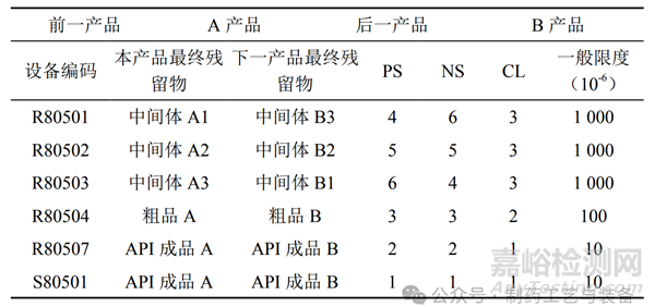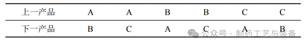 當(dāng)兩個產(chǎn)品交叉換產(chǎn)時,A 產(chǎn)品換到 B 產(chǎn)品及 B 產(chǎn)品換到 A 產(chǎn)品應(yīng)形成兩個清潔殘留計算矩陣表,三個產(chǎn)品應(yīng)形成6種組合,示例如表4共用產(chǎn)品交叉表。