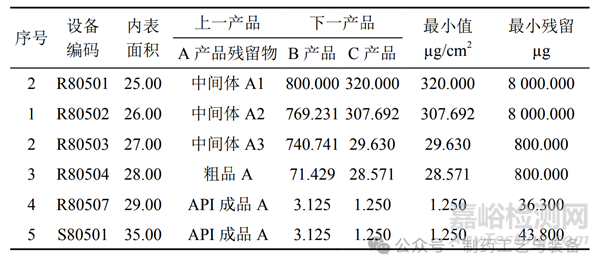 根據(jù)以上不同產(chǎn)品之間建立的清潔殘留計算矩陣表(見表5),通過計算機(jī)輔助編程可以分別得到待清潔產(chǎn)品與其他產(chǎn)品共用時不同的殘留可接受限度,但不管下一產(chǎn)品是生產(chǎn)B產(chǎn)品還是C產(chǎn)品,對于A產(chǎn)品的清潔方法通常是一致的,所以應(yīng)該選擇計算出的最小值作為殘留限度,A產(chǎn)品的殘留限度見表6。