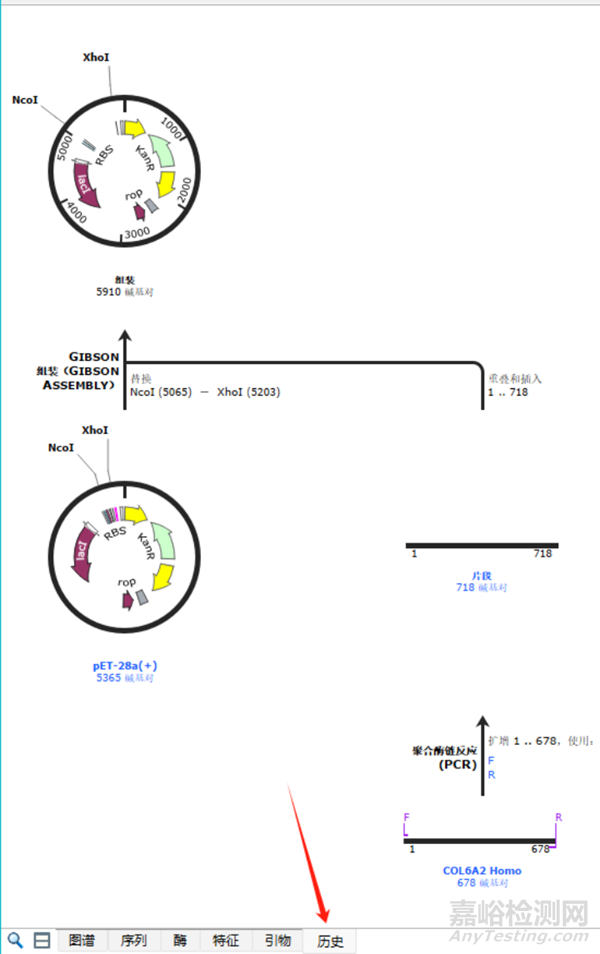 綜上,我們在完成引物設計的過程中也完成了整個實驗流程的模擬。此時我們可以合成引物同時將組裝好的圖譜“歷史”欄打開,打印整個流程,撰寫protocol。