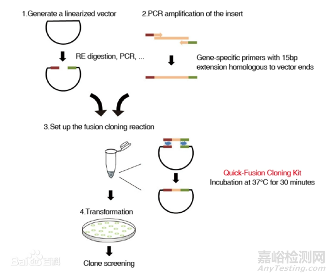 無(wú)縫克隆可將插入片段定向克隆至任意載體的任意位點(diǎn),不需要任何限制性內(nèi)切酶和連接酶,重組效率高。將載體進(jìn)行線性化,在插入片段正/反向PCR引物5’端引入線性化載體的末端序列,使得PCR產(chǎn)物5’和3’最末端分別帶有和線性化載體兩末端一致的序列(15 - 20 bp)。這種PCR產(chǎn)物和線性化載體按一定比例混合后,在重組酶的催化下,37℃反應(yīng)30 min即可進(jìn)行轉(zhuǎn)化,完成定向克隆。