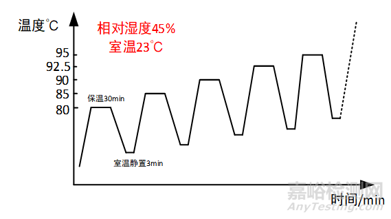 溫度應(yīng)力的預(yù)實(shí)驗(yàn)中保證實(shí)驗(yàn)環(huán)境的相對(duì)濕度為智能電能表正常工況下的濕度且固定為25%不變。根據(jù)電能表的結(jié)構(gòu)特征以及前期裝配、工作經(jīng)驗(yàn),將溫度應(yīng)力試驗(yàn)的初始溫度定為70℃,以5℃為步長(zhǎng)進(jìn)行溫度步進(jìn)加速試驗(yàn),每步長(zhǎng)持續(xù)30min,步長(zhǎng)之間將電能表靜置3min,并持續(xù)監(jiān)測(cè)電能表工作狀態(tài),記錄電能表的狀態(tài)參數(shù)。當(dāng)靠近電能表的工作極限溫度90℃時(shí),步長(zhǎng)從5℃下調(diào)為2.5℃。當(dāng)電能表在某一溫度出現(xiàn)故障且將溫度調(diào)回上一步長(zhǎng)時(shí)電能表恢復(fù)正常工作,則該溫度為電能表的極限工作溫度,記錄該極限溫度的數(shù)值T3。為后續(xù)加速壽命試驗(yàn)應(yīng)力組合提供參考。溫度應(yīng)力步進(jìn)預(yù)試驗(yàn)剖面圖如圖2所示。