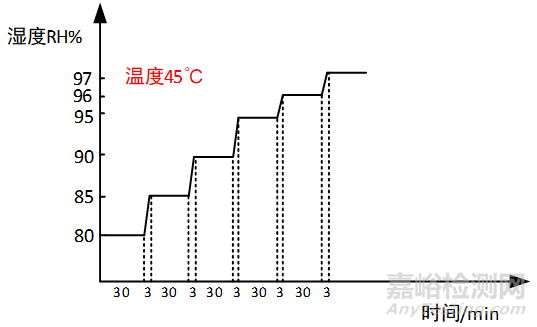 濕度應(yīng)力的預(yù)實(shí)驗(yàn)中需要保證實(shí)驗(yàn)環(huán)境的溫度為電能表的正常工況下的溫度且固定為25℃不變。將濕度應(yīng)力試驗(yàn)的初始溫度定為80%,以5%為步長(zhǎng)進(jìn)行濕度步進(jìn)加速試驗(yàn),每一步長(zhǎng)持續(xù)30min,步長(zhǎng)之間將電能表靜置3min,并對(duì)電能表進(jìn)行性能測(cè)試,并持續(xù)監(jiān)測(cè)電能表工作狀態(tài)。當(dāng)靠近電能表的工作極限濕度100%時(shí),步長(zhǎng)從5%下調(diào)為2.5%。記錄該極限相對(duì)濕度的數(shù)值RH3,為后續(xù)加速壽命試驗(yàn)應(yīng)力組合提供參考。濕度應(yīng)力步進(jìn)預(yù)試驗(yàn)剖面圖如圖3所示。