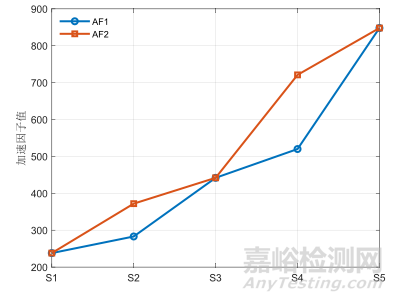 如圖5所示,表1中應(yīng)力組合S1和S2的加速因子238和283相對(duì)接近,這表明S1、S2兩種應(yīng)力組合對(duì)電能表退化過(guò)程的加速效果相近,同時(shí)表1中應(yīng)力組合S4和S5的加速因子520和848差距過(guò)大,這表明S4、S5兩種應(yīng)力組合對(duì)電能表退化過(guò)程的加速效果相差太大,無(wú)法正確體現(xiàn)步進(jìn)效果。相比較而言,方案二的加速因子數(shù)值遞進(jìn)更加均衡,更能準(zhǔn)確反映出不同溫濕度條件下對(duì)電能表的退化過(guò)程的加速程度。因此,選擇方案二作為試驗(yàn)的加速應(yīng)力組合。