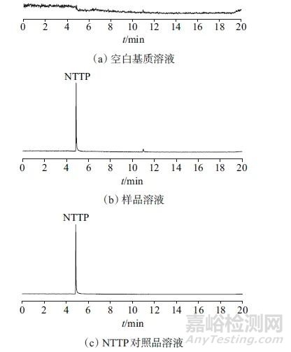 取空白基質(zhì)溶液、樣品溶液、對照品溶液,按所建方法分別進(jìn)行測定,記錄色譜圖(如圖1所示)。由圖1可以看出,在優(yōu)化的儀器工作條件下,NTTP在4.867 min出峰,空白基質(zhì)溶液、樣品溶液對目標(biāo)峰無干擾,該方法專屬性良好。