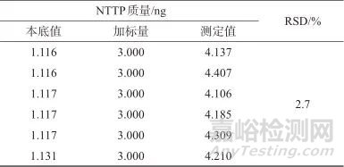取同一批樣品,平行稱樣6份,每份稱取約0.2 g,分別加入NTTP對照品中間溶液200 μL,按樣品溶液配制方法制備加標(biāo)樣品溶液,在1.2儀器工作條件下進(jìn)行分析,結(jié)果見表4。由表4可知,6份加標(biāo)樣品溶液測定結(jié)果的相對標(biāo)準(zhǔn)偏差為2.7%,表明該方法精密度良好。