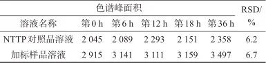 取NTTP對照品溶液和加標(biāo)樣品溶液,分別于配制完成后第0、6、12、18、36 h取樣測定,計(jì)算色譜峰面積,結(jié)果見表6。由表6可知,NTTP色譜峰面積測定結(jié)果的相對標(biāo)準(zhǔn)偏差分別為6.2%、6.7%,表明NTTP對照品溶液和加標(biāo)樣品溶液在36 h內(nèi)穩(wěn)定性均良好。