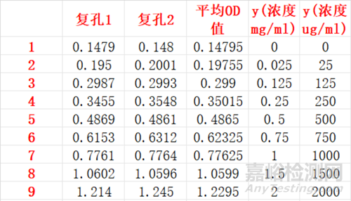 a.新建一個Excel表格,將得到的標準品的吸光度按照下方表格排列,并按照試劑說明說輸入相應(yīng)標準品的濃度(這里作者剔除了一個離群值);