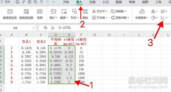b.選中標準品的吸光度和濃度,點擊“插入”,選擇散點圖;