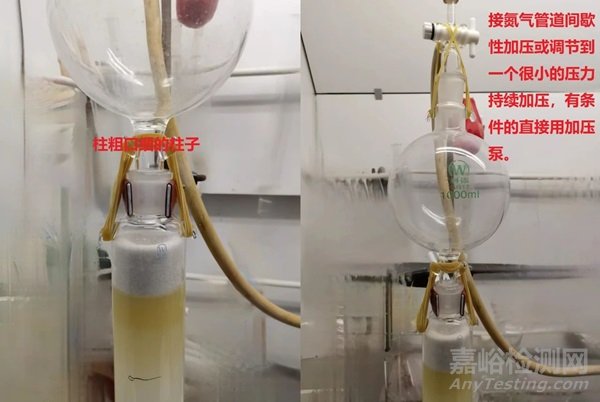 完全壓干溶劑:對于柱徑大的柱子,柱層析結(jié)束后,間歇性加壓干大部分溶劑,然后調(diào)節(jié)到一個很小的壓力(一定要特別仔細(xì)的調(diào)節(jié),防止壓力積蓄,將三通沖出,確保下方滴液口有持續(xù)很小氣流就可以),最好的方法就是直接接上加壓泵,壓一段時間后,柱子里的硅膠明顯從上向下緩慢變白,最后完全變白后,就可以從上方將硅膠直接倒出。