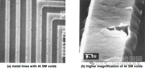 在鋁合金互連中空洞的形核和生長過程中,應(yīng)力和應(yīng)力松弛的作用非常重要。鋁中的銅摻雜在抑制晶界擴(kuò)散方面有一定效果,但如晶粒尺寸與線寬相比過大效果就會(huì)差很多,研究發(fā)現(xiàn)由于晶內(nèi)擴(kuò)散會(huì)形成狹縫狀空洞。