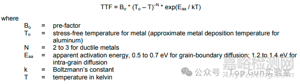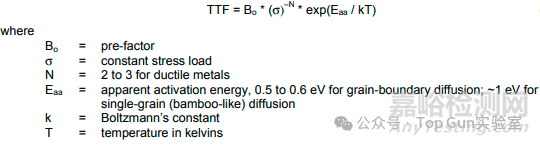 失效時(shí)間(TTF)可以使用埃林模型,在該模型中,計(jì)算機(jī)械應(yīng)力的冪律與阿倫尼烏斯因子的乘積。