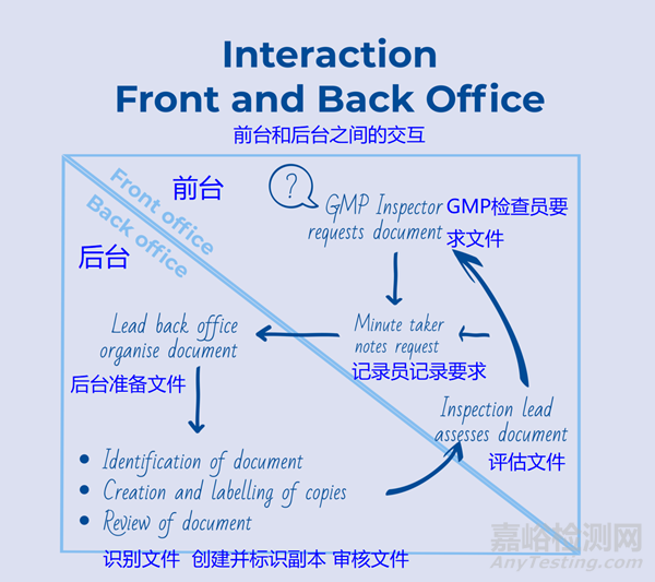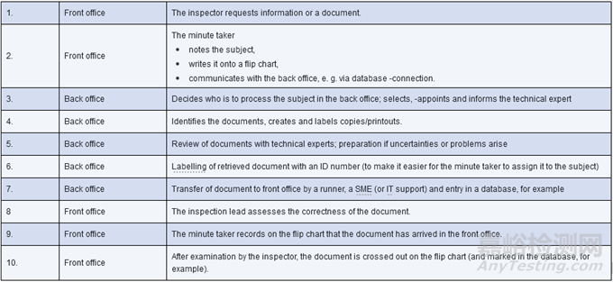 重要的QA、QC和QM文件通常在檢查開始前幾天送達(dá)后臺(tái)辦公室。因此,它們可以在檢查過程中迅速找到。后臺(tái)辦公室也提供對(duì)質(zhì)量部門IT系統(tǒng)的訪問。有經(jīng)驗(yàn)的檢查專員了解后臺(tái)辦公室提供的支持,并經(jīng)常在討論結(jié)束后訪問后臺(tái)辦公室,感謝那里的人員提供的支持。