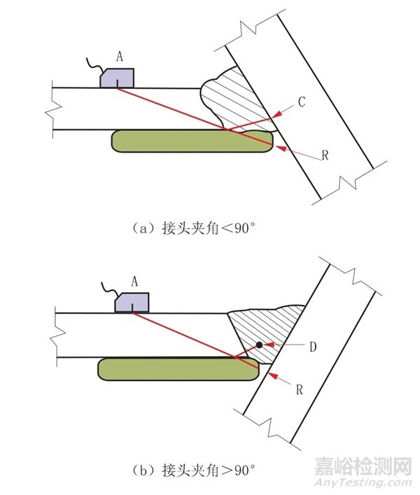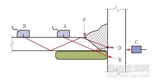 (1)從“C”點用直探頭檢測來確定是否存在缺陷“D”的反射回波(如果“C”點位置可以進行檢測)。