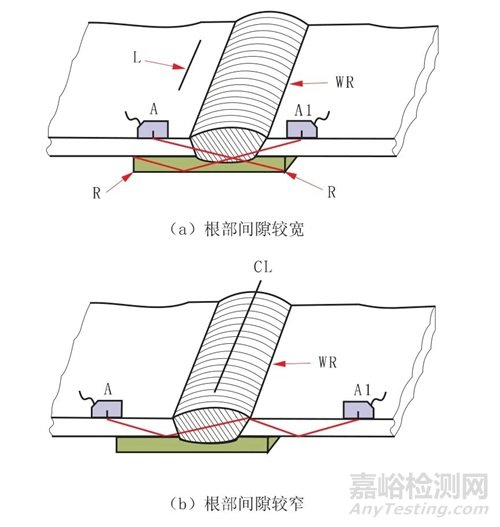 (4)如果“WR”不是反射體,按照如下方法,來驗證鋼墊板是否是反射源,將探頭放在“A1”或“A”處以得到最大的反射回波高度,測量從探頭入射點到反射體的投射表面距離,標記探頭從焊縫對側(cè)的尺寸記為“L”,測量從“L”到“WR”的尺寸,這一尺寸應為鋼墊板寬度(如果超聲設(shè)備經(jīng)過精確校準的話)。因此超聲檢測人員在檢測前應詳細了解所用鋼墊板的尺寸和基本的根部間隙尺寸情況,它可以排除一些關(guān)于反射源的問題(這也是超聲檢測人員需要熟悉焊接結(jié)構(gòu)的主要原因)。