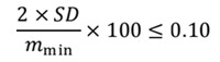 備注:對(duì)于精密稱定操作,準(zhǔn)確度限度值RWT為0.10%;按95%的置信區(qū)間計(jì)算時(shí)(k=2),該公式可簡(jiǎn)化為:mmin=2000×SD,當(dāng)SD<0.41d時(shí),mmin=820×d |