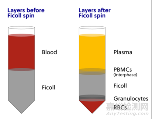 1) 使用Ficoll溶液進(jìn)行離心分層后,血液成分會(huì)按密度梯度重新排列。血漿和血小板由于密度較低,會(huì)浮在分層液的上部;PBMC(外周血單個(gè)核細(xì)胞)的密度稍低于Ficoll溶液,因此在界面處形成一層白膜;而紅細(xì)胞和粒細(xì)胞因密度較高,會(huì)沉積在分層液的底部。