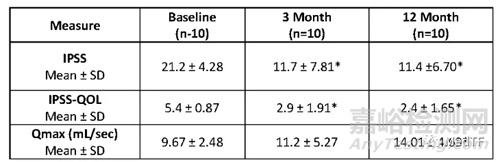 在12個月時,患者的IPSS較基線顯著降低,評分從21.2降至11.4(P<0.01)。