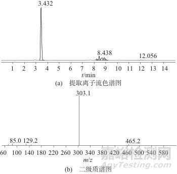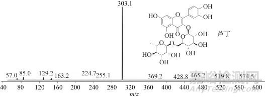 圖1 槐米提取液特征化合物(m/z 303)的二級質(zhì)譜圖