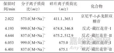 Tab. 3 Characteristic dye components and secondary fragment ions in gardenia